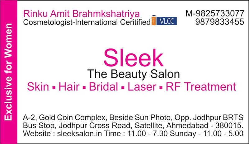 Sleek The Beauty Salon is the brand name by which Mrs. Rinku Amit Brahmkshatriya runs her bridal makeup business from Ahmedabad in the state of Gujarat. Rinku is an artist who is fervent and enthusiastic about her work. She loves what she does, and her clients are sure to sense it in the way she does her magic! She is a delightful person to interact with and her amicability is sure to keep the clients at ease. They are professionally certified makeup artists who will give you a flawless makeover...