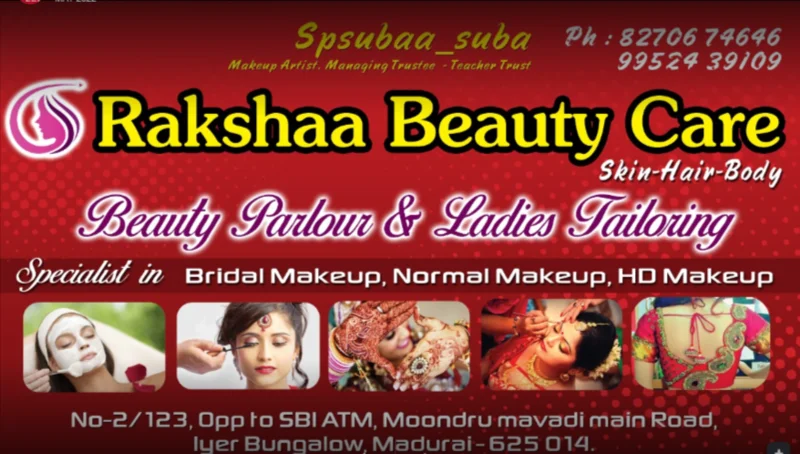 Best Beauty care . Rakshaa Beauty Care is registered under Ministry of Micro, Small and Medium Enterprises (MSME) , Government of India. [Regn. No : Udyam-TN-12-0017209]. It offers Makeup, Hair Coloring, Hair Straightening, Perming, Hair Treatments, Facials, Skin treatments, Pedicure, Manicure & Cosmetic retail. Since it is run by Teacher Trust it also offers certified training for those want to become beautician